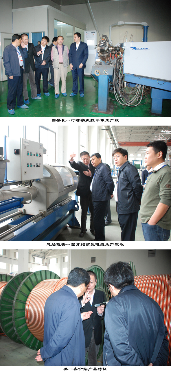 曲縣長一行首先考察參觀了公司高壓分廠。參觀過程中,曲縣長對公司斥資從芬蘭麥拉菲爾公司引進的110kV三層共擠交聯(lián)電纜生產(chǎn)線產(chǎn)生了濃厚的興趣,并對該設(shè)備先進的技術(shù)水準及所生產(chǎn)產(chǎn)品的優(yōu)良品質(zhì)給予了肯定,同時,區(qū)縣長對公司注重科技研發(fā)與自主創(chuàng)新的的舉措表示了支持和贊賞。